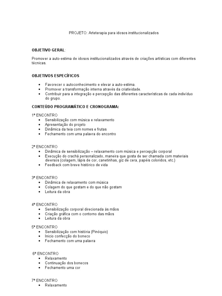 CONTEDO PROGRAMTICO E CRONOGRAMA: 1 ENCONTRO Sensibilizao com msica e relaxamento Apresentao do projeto Dinmica da teia com nomes e frutas Fechamento com uma palavra do encontro 2 ENCONTRO Dinmica de sensibilizao relaxamento com msica e percepo corporal Execuo do crach personalizado, maneira que gosta de ser chamada com materiais diversos (colagem, lpis de cor, canetinhas, giz de cera, papis coloridos, etc.) Feedback com breve histrico de vida 3 ENCONTRO Dinmica de relaxamento com msica Colagem do que gostam e do que no gostam Leitura da obra 4 ENCONTRO Sensibilizao corporal direcionada s mos Criao grfica com o contorno das mos Leitura da obra 5 ENCONTRO Sensibilizao com histria (Pinquio) Inicio confeco do boneco Fechamento com uma palavra 6 ENCONTRO Relaxamento Continuao dos bonecos Fechamento uma cor 7 ENCONTRO Relaxamento