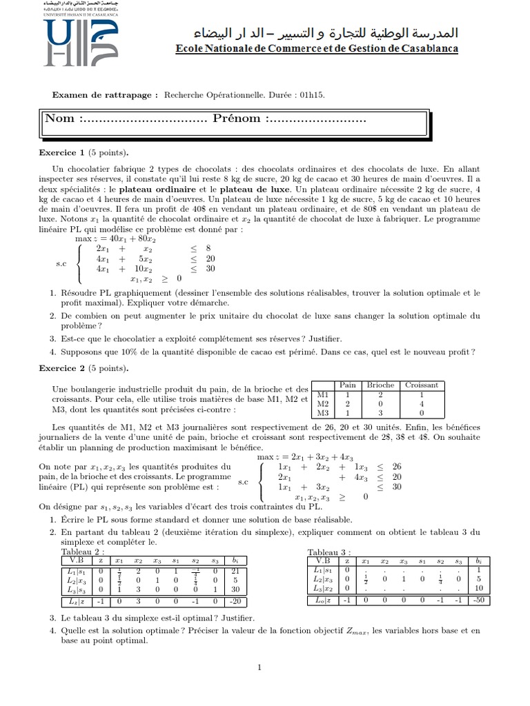 Examen de rattrapage : Recherche Opérationnelle. Durée : 01h15.