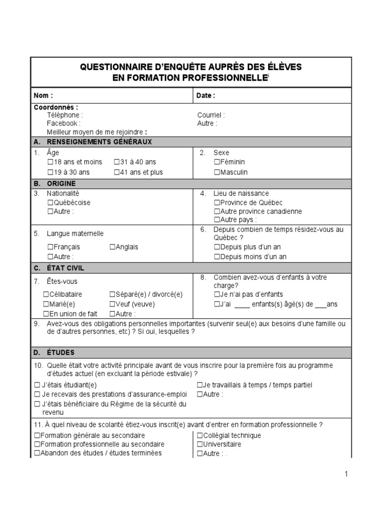 QUESTIONNAIRE D’ENQUÊTE AUPRÈS DES ÉLÈVES