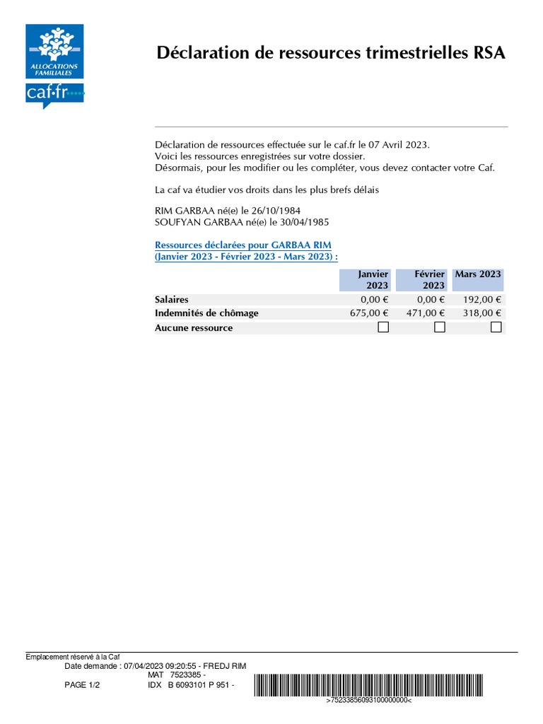 Déclaration de ressources effectuée sur le [Link] le 07 Avril 2023.