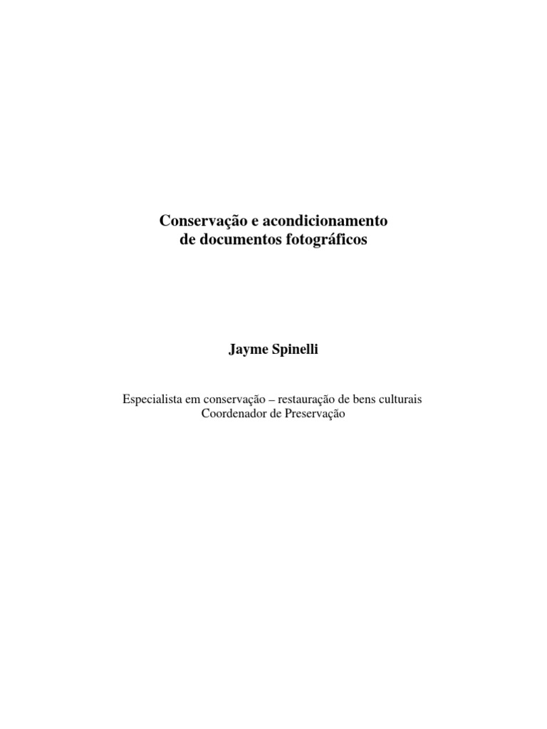 CADERNO tcnico: administrao de emergncia. Rio de Janeiro: Arquivo Nacional, 1997. Projeto de Conservao Preventiva em Bibliotecas e Arquivos. http://www.cpba.net CANADIAN ASSOCIATION FOR CONSERVATION. What is conservation? http://www.cac/accr.ca/ewhatis.html. SPINELLI JUNIOR, Jayme. Conservao de Acervos Bibliogrficos e Documentais. Rio de Janeiro: Fundao Biblioteca Nacional, 1990. 60 p. Ce.: spinelli@bn.br SILVIA, Srgio Conde de Albite. Algumas reflexes sobre preservao de acervos e bibliotecas. Rio de Janeiro: Academia Brasileira de Letras, 1998. 36 p. CARVALHO, Claudia S. Rodrigues de. O espao como elemento de Preservao dos acervos como suporte em papel. Rio de Janeiro: Academia Brasileira de Letras, 1998. 44 p. BURGI, Sergio. Organizao e Preservao de Acervos Fotogrficos. Rio de Janeiro: Instituto Moreira Salles, 2001. http://www.ims.com.br OLIVEIRA, Joo Socrates de. Manual Prtico de Preservao Fotogrficas. So Paulo, 1980. 47 p. REILLY, James M. Care and Indentification of 19 th Century Photographic Printa. Nova York: Eastman Kodak Company, 1986. PAVO, Luis. Conservao de Colees de Fotografia. Lisboa: Editora Dina livro, 1997. Ce.: http://www.saraiva.com.br