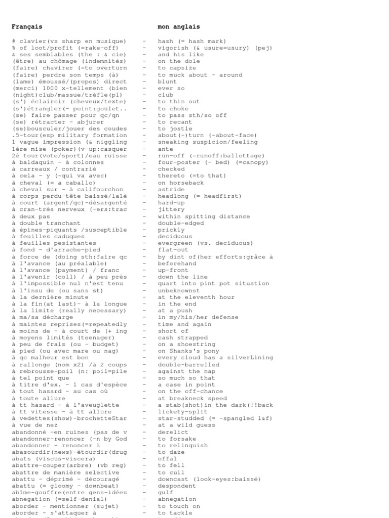 (faire) chavirer (=to overturn (faire) perdre son temps () (lame) mouss/(propos) direct (merci) 1000 x-tellement (bien (night)club/massue/trfle(pl) (s') claircir (cheveux/texte) (s')trangler(- point:goulet.. (se) faire passer pour qc/qn (se) rtracter - abjurer (se)bousculer/jouer des coudes .5-tour(esp military formation 1 vague impression (& niggling 1re mise (poker)(v-up:casquer 2 tour(vote/sport)/eau ruisse baldaquin - colonnes carreaux / contrari cela - y (~qui va avec) cheval (= a caballo) cheval sur - califourchon corps perdu-tte baiss/la1 court (argent/qc)-dsargent cran-trs nerveux (-ers:trac deux pas double tranchant pines-piquants /susceptible feuilles caduques feuilles pesistantes fond - d'arrache-pied force de (doing sth:faire qc l'avance (au pralable) l'avance (payment) / franc l'avenir (coll) / peu prs l'impossible nul n'est tenu l'insu de (ou sans st) la dernire minute la fin(at last)- la longue la limite (really necessary) ma/sa dcharge maintes reprises(=repeatedly moins de - court de (+ ing moyens limits (teenager) peu de frais (ou - budget) pied (ou avec mare ou nag) qc malheur est bon rallonge (nom x2) / 2 coups rebrousse-poil (n: poil=pile tel point que titre d'ex. - 1 cas d'espce tout hasard - au cas o toute allure tt hasard - l'aveuglette tt vitesse - tt allure vedettes(show)-brochetteStar vue de nez abandonn -en ruines (pas de v abandonner-renoncer (-n by God abandonner - renoncer abasourdir(news)-tourdir(drug abats (viscus-viscera) abattre-couper(arbre) (vb reg) abattre de manire selective abattu - dprim - dcourag abattu (= gloomy - downbeat) abme-gouffre(entre gens-ides abnegation (=self-denial) aborder - mentionner (sujet) aborder - s'attaquer aborder (? - pb)(=to broach) -