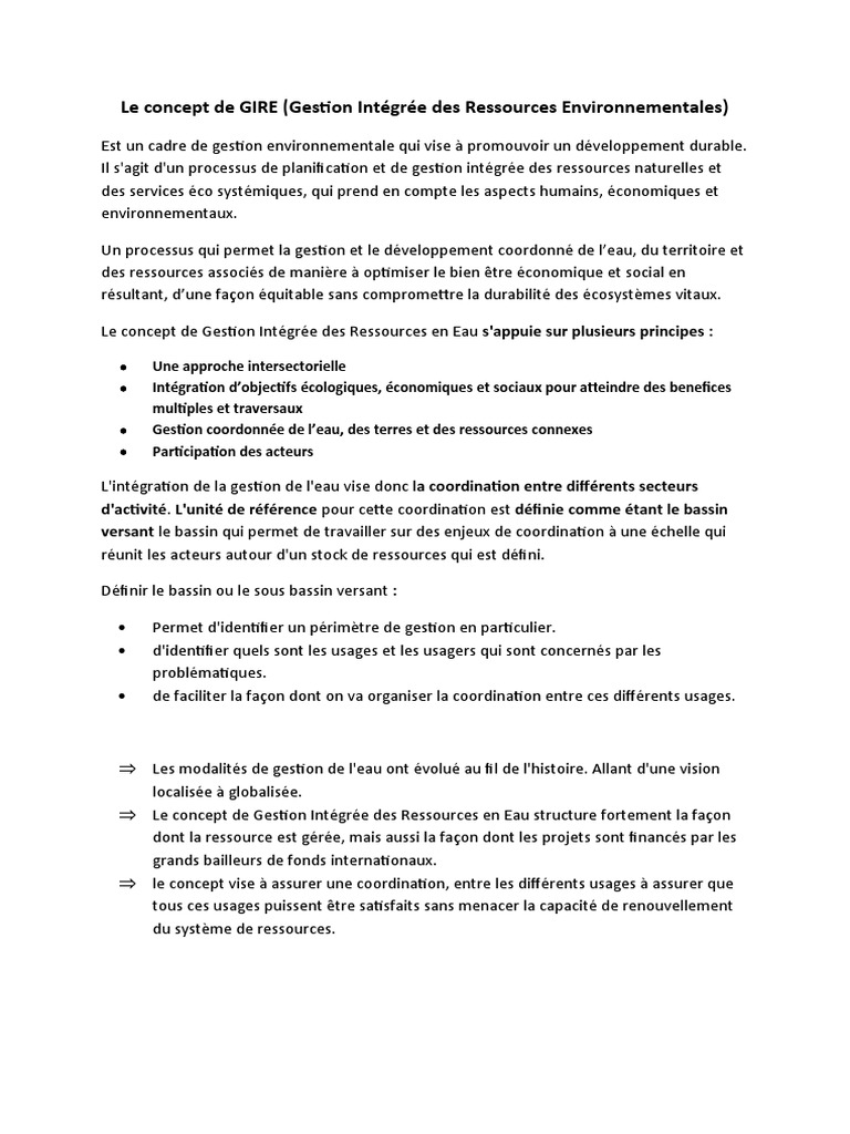 Le concept de GIRE (Gestion Intégrée des Ressources Environnementales)