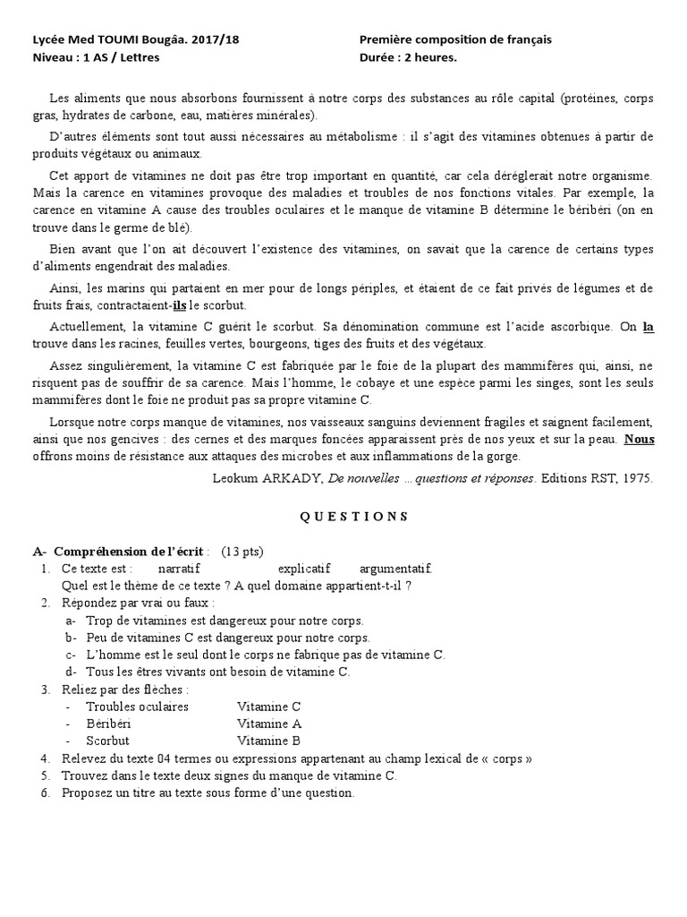 Niveau : 1 AS / Lettres Durée : 2 heures.