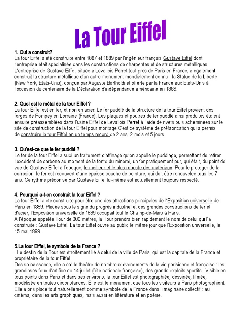 4. Pourquoi a-t-on construit la tour Eiffel ?