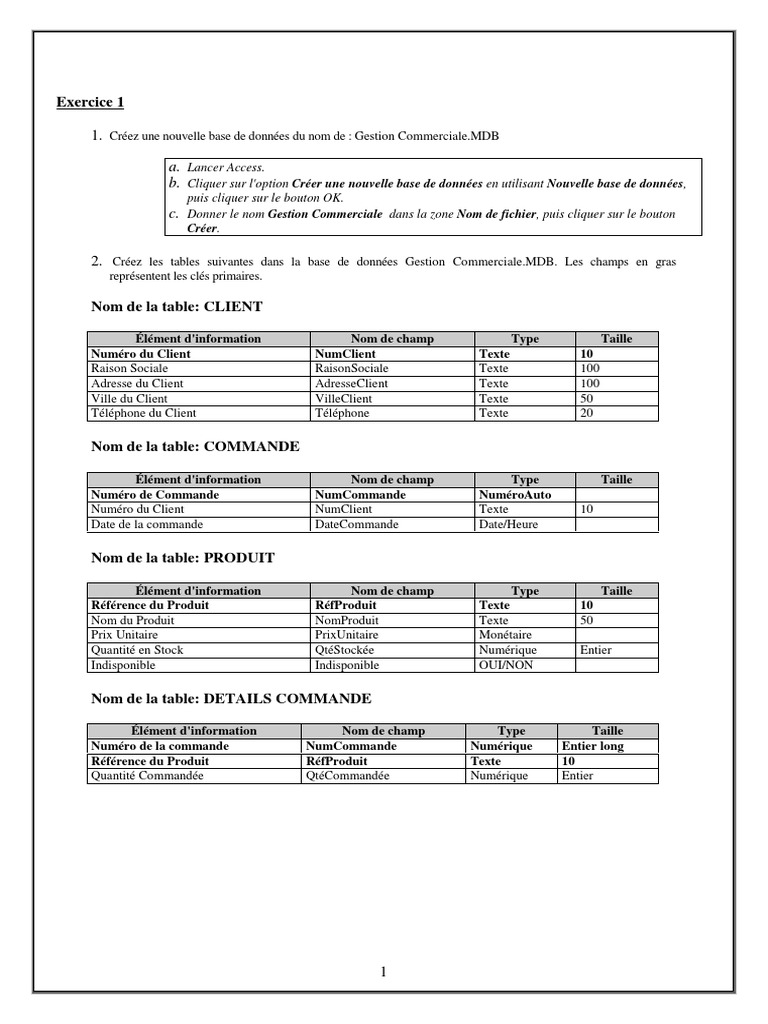 1. Créez une nouvelle base de données du nom de : Gestion Commerciale.MDB