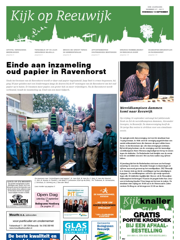 Oplage: 6.300 exemplaren Uitgever: Elly de Knikker Kijk op Reeuwijk is een handelsnaam van Graficelly B.V. Hoofdredacteur: Paul Engels Tel. (0182) 394 810 redactie@kijkopreeuwijk.nl Redactiemedewerkers: Wim de Boevre, Jeroen Kok, Ruud Kooistra, Pancras Kuipers, Marlien van Leeuwen, Narda Rebel, Bert Verver, Karin Wagter Inleveren kopij: uiterlijk maandag 09.00 uur Overname artikelen toegestaan met bronvermelding: Kijk op Reeuwijk Advertenties: Letty Blanken Tel. (0182) 399 266 advertentie@kijkopreeuwijk.nl Reservering vr vrijdag 17.00 uur. Daarna kan plaatsing niet gegarandeerd worden. Informatie over tarieven en aanleveren op aanvraag via advertentie@kijkopreeuwijk.nl of op www.kijkopreeuwijk.nl Druk: Rodi Rotatiedruk Broek op Langedijk Bezorging: Reclameverspreiding Bodegraven (0172) 615 588 Bereikbaar tijdens kantooruren. bezorging@kijkopreeuwijk.nl