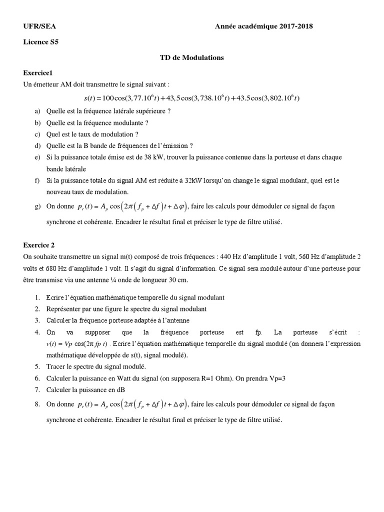 d) Calculez la puissance contenue dans la porteuse (on suppose que la puissance est mesurée au borne d’une antenne