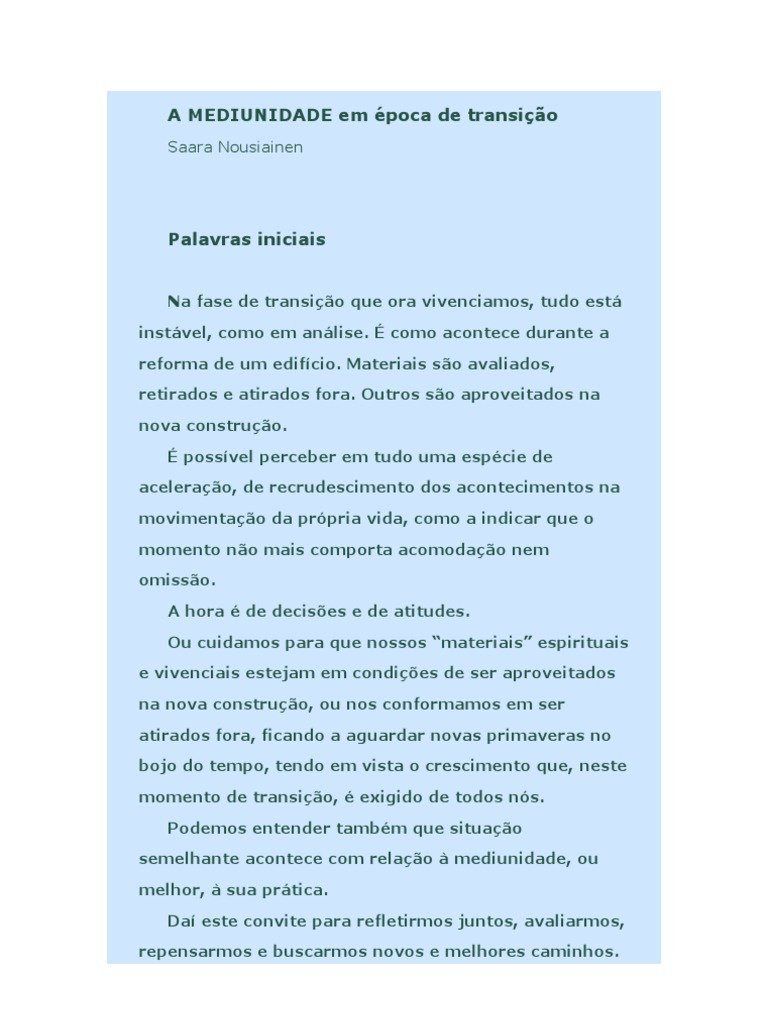 Na fase de transio que ora vivenciamos, tudo est instvel, como em anlise. como acontece durante a reforma de um edifcio. Materiais so avaliados, retirados e atirados fora. Outros so aproveitados na nova construo. possvel perceber em tudo uma espcie de acelerao, de recrudescimento dos acontecimentos na movimentao da prpria vida, como a indicar que o momento no mais comporta acomodao nem omisso. A hora de decises e de atitudes. Ou cuidamos para que nossos materiais espirituais e vivenciais estejam em condies de ser aproveitados na nova construo, ou nos conformamos em ser atirados fora, ficando a aguardar novas primaveras no bojo do tempo, tendo em vista o crescimento que, neste momento de transio, exigido de todos ns. Podemos entender tambm que situao semelhante acontece com relao mediunidade, ou melhor, sua prtica. Da este convite para refletirmos juntos, avaliarmos, repensarmos e buscarmos novos e melhores caminhos.