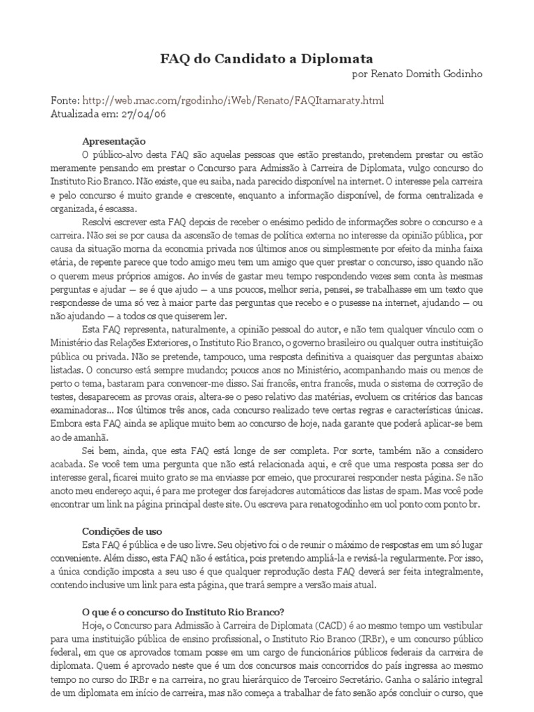 Apresentação O público-alvo desta FAQ são aquelas pessoas que estão prestando, pretendem prestar ou estão meramente pensando em prestar o Concurso para Admissão à Carreira de Diplomata, vulgo concurso do