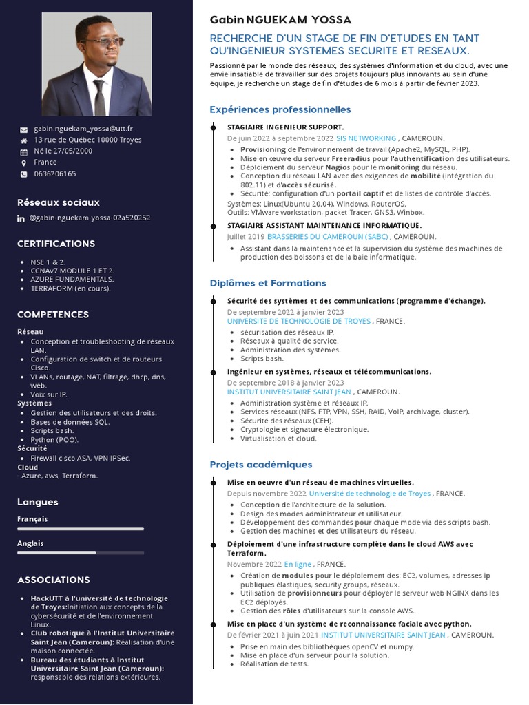 13 rue de Québec 10000 Troyes De juin 2022 à septembre 2022 SIS NETWORKING , CAMEROUN.