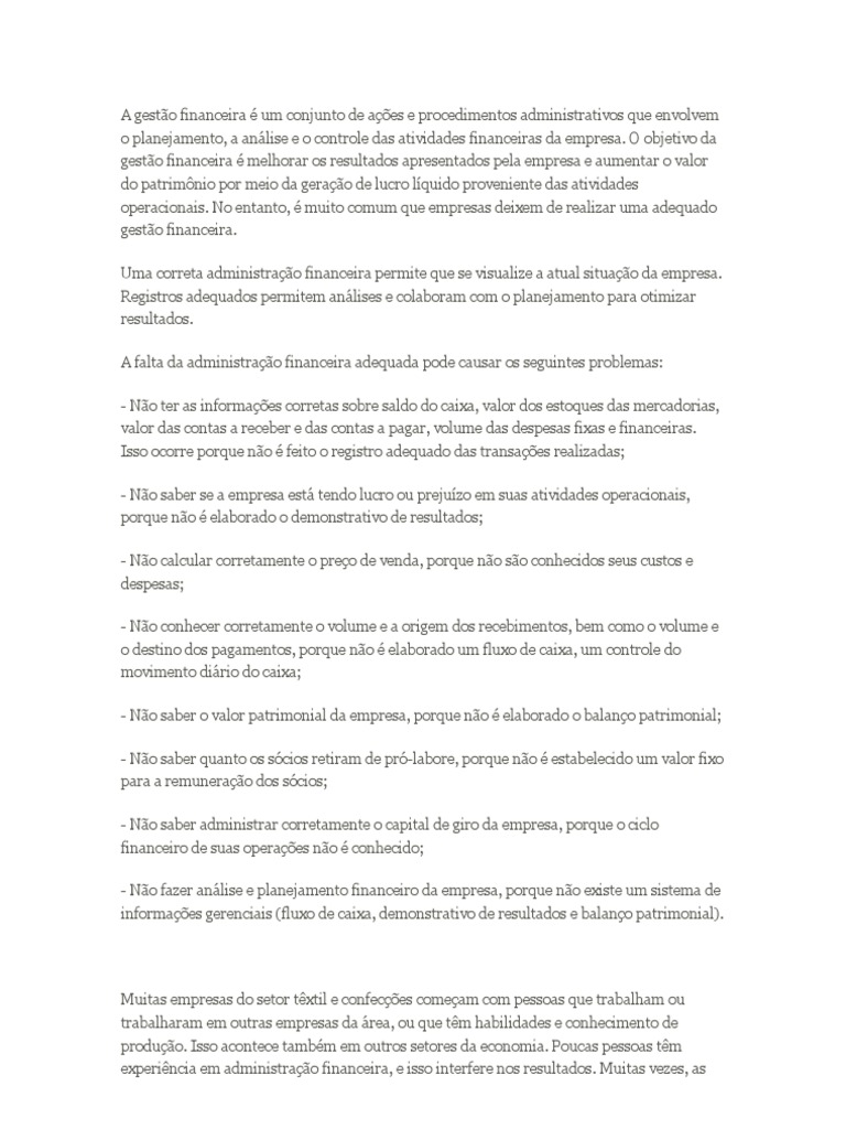 Muitas empresas do setor txtil e confeces comeam com pessoas que trabalham ou trabalharam em outras empresas da rea, ou que tm habilidades e conhecimento de produo. Isso acontece tambm em outros setores da economia. Poucas pessoas tm experincia em administrao financeira, e isso interfere nos resultados. Muitas vezes, as