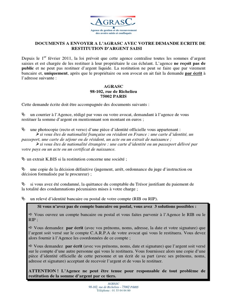 saisies et est chargée de les restituer à leur propriétaire le cas échéant. L’agence ne reçoit pas de