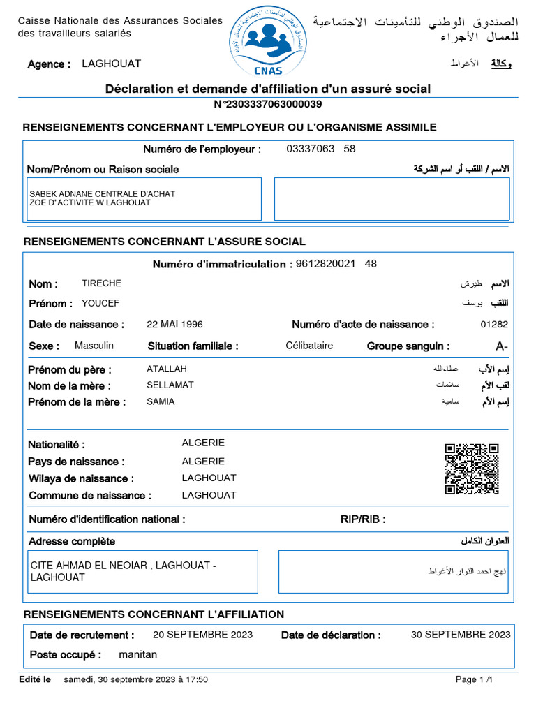 Déclaration et demande d'affiliation d'un assuré social