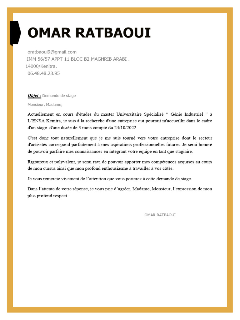 de pouvoir parfaire mes connaissances en intégrant votre équipe en tant que stagiaire.