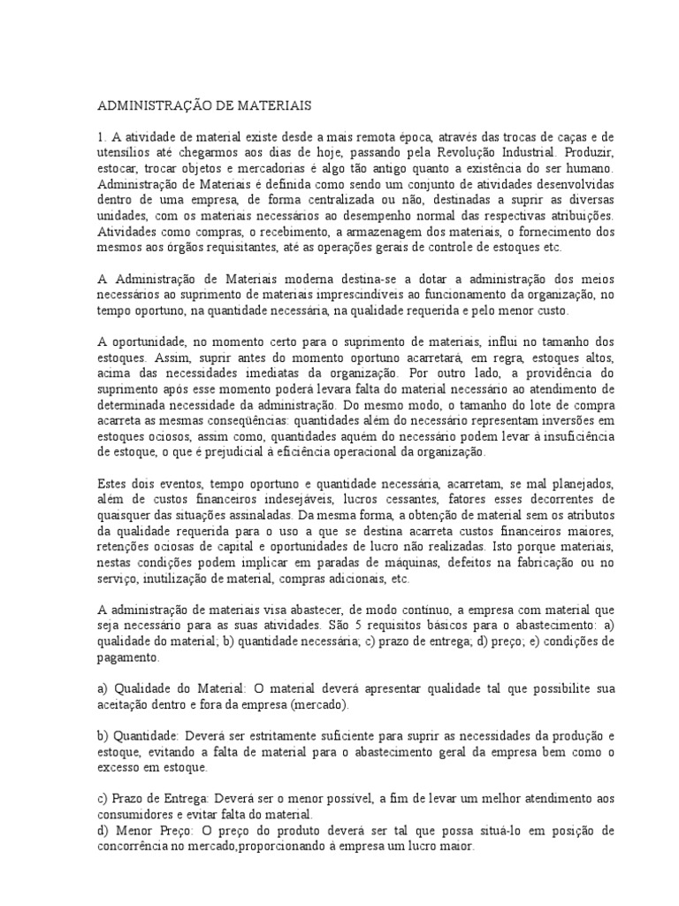A atividade de material existe desde a mais remota poca, atravs das trocas de caas e de utenslios at chegarmos aos dias de hoje, passando pela Revoluo Industrial. Produzir, estocar, trocar objetos e mercadorias algo to antigo quanto a existncia do ser humano. Administrao de Materiais definida como sendo um conjunto de atividades desenvolvidas dentro de uma empresa, de forma centralizada ou no, destinadas a suprir as diversas unidades, com os materiais necessrios ao desempenho normal das respectivas atribuies. Atividades como compras, o recebimento, a armazenagem dos materiais, o fornecimento dos mesmos aos rgos requisitantes, at as operaes gerais de controle de estoques etc. A Administrao de Materiais moderna destina-se a dotar a administrao dos meios necessrios ao suprimento de materiais imprescindveis ao funcionamento da organizao, no tempo oportuno, na quantidade necessria, na qualidade requerida e pelo menor custo. A oportunidade, no momento certo para o suprimento de materiais, influi no tamanho dos estoques. Assim, suprir antes do momento oportuno acarretar, em regra, estoques altos, acima das necessidades imediatas da organizao. Por outro lado, a providncia do suprimento aps esse momento poder levara falta do material necessrio ao atendimento de determinada necessidade da administrao. Do mesmo modo, o tamanho do lote de compra acarreta as mesmas conseqncias: quantidades alm do necessrio representam inverses em estoques ociosos, assim como, quantidades aqum do necessrio podem levar insuficincia de estoque, o que prejudicial eficincia operacional da organizao. Estes dois eventos, tempo oportuno e quantidade necessria, acarretam, se mal planejados, alm de custos financeiros indesejveis, lucros cessantes, fatores esses decorrentes de quaisquer das situaes assinaladas. Da mesma forma, a obteno de material sem os atributos da qualidade requerida para o uso a que se destina acarreta custos financeiros maiores, retenes ociosas de capital e oportunidades de lucro no realizadas. Isto porque materiais, nestas condies podem implicar em paradas de mquinas, defeitos na fabricao ou no servio, inutilizao de material, compras adicionais, etc. A administrao de materiais visa abastecer, de modo contnuo, a empresa com material que seja necessrio para as suas atividades. So 5 requisitos bsicos para o abastecimento: a) qualidade do material; b) quantidade necessria; c) prazo de entrega; d) preo; e) condies de pagamento. a) Qualidade do Material: O material dever apresentar qualidade tal que possibilite sua aceitao dentro e fora da empresa (mercado). b) Quantidade: Dever ser estritamente suficiente para suprir as necessidades da produo e estoque, evitando a falta de material para o abastecimento geral da empresa bem como o excesso em estoque. c) Prazo de Entrega: Dever ser o menor possvel, a fim de levar um melhor atendimento aos consumidores e evitar falta do material. d) Menor Preo: O preo do produto dever ser tal que possa situ-lo em posio de concorrncia no mercado,proporcionando empresa um lucro maior.