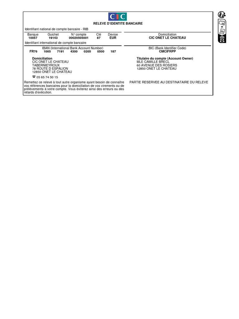 FR76 1005 7191 4300 0205 0500 187 CMCIFRPP