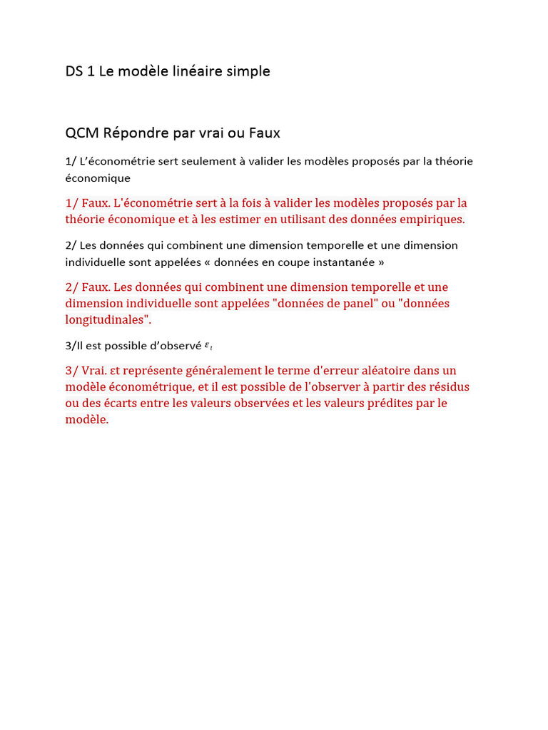 1/ Donner les estimateurs de β 0 et β 1selon la méthode MCO
