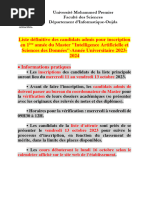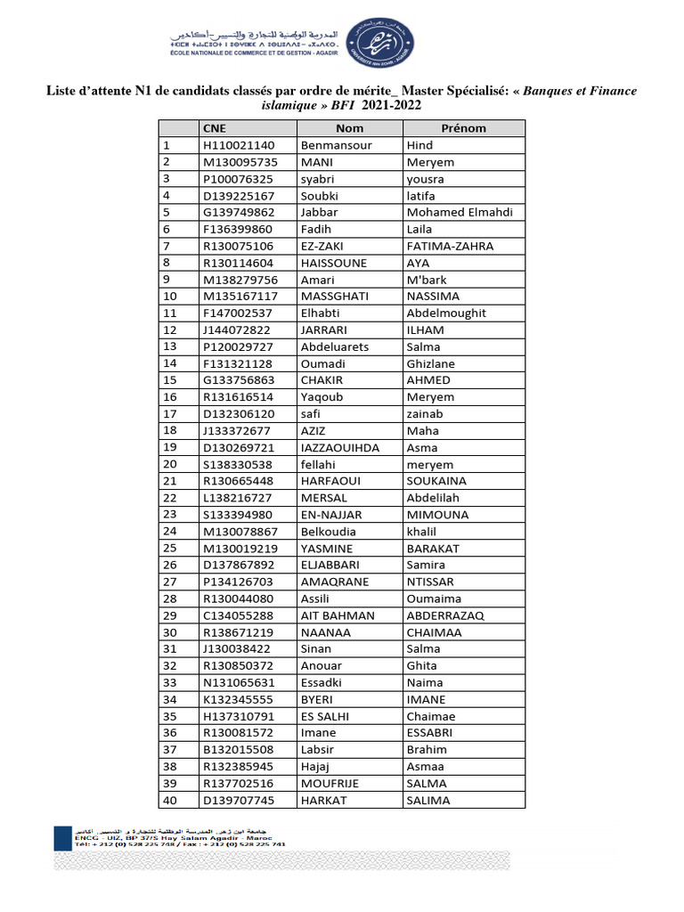 Liste d’attente N1 de candidats classés par ordre de mérite_ Master Spécialisé: « Banques et Finance