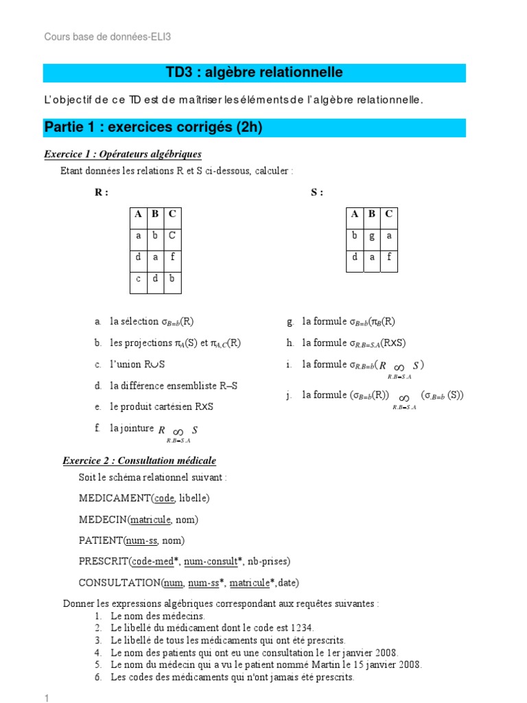 Lobjectif de ce TD est de matriser les lments de lalgbre relationnelle.
