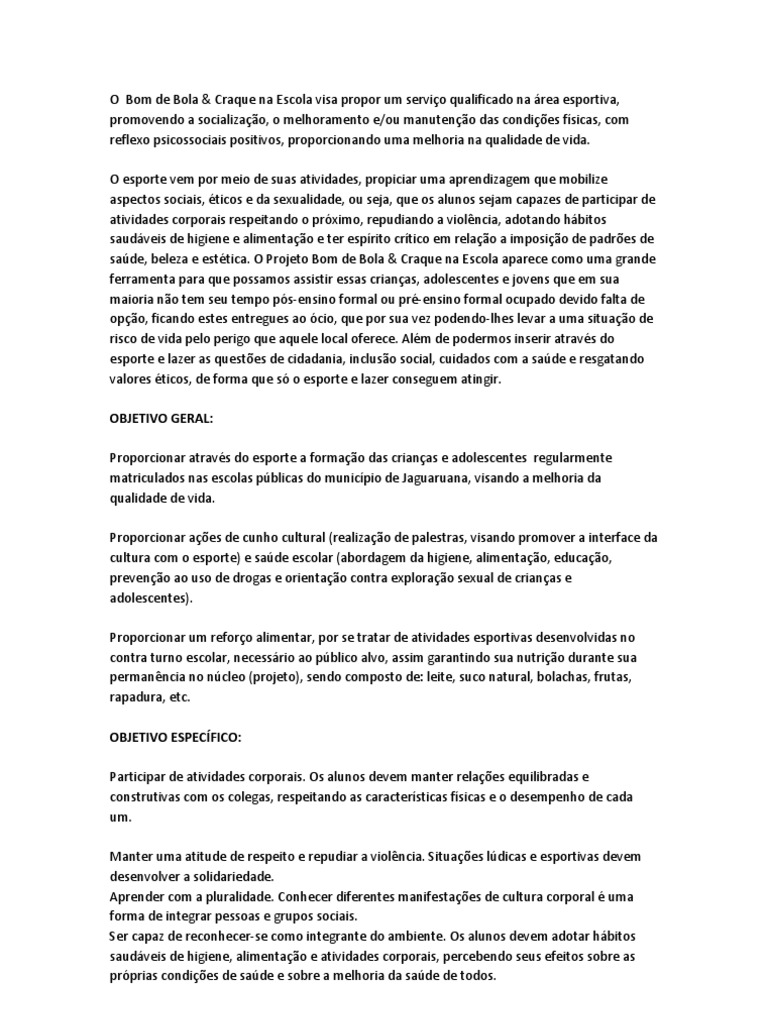 manuteno das condies fsicas, com reflexo psicossociais positivos, proporcionando uma melhoria na qualidade de vida. O esporte vem por meio de suas atividades, propiciar uma aprendizagem que mobilize aspectos sociais, ticos e da sexualidade, ou seja, que os alunos sejam capazes de participar de atividades corporais respeitando o prximo, repudiando a violncia, adotando hbitos saudveis de higiene e alimentao e ter esprito crtico em relao a imposio de padres de sade, beleza e esttica. O Projeto Bom de Bola & Craque na Escola aparece como uma grande ferramenta para que possamos assistir essas crianas, adolescentes e jovens que em sua maioria no tem seu tempo ps-ensino formal ou pr-ensino formal ocupado devido falta de opo, ficando estes entregues ao cio, que por sua vez podendo-lhes levar a uma situao de risco de vida pelo perigo que aquele local oferece. Alm de podermos inserir atravs do esporte e lazer as questes de cidadania, incluso social, cuidados com a sade e resgatando valores ticos, de forma que s o esporte e lazer conseguem atingir. OBJETIVO GERAL: Proporcionar atravs do esporte a formao das crianas e adolescentes regularmente matriculados nas escolas pblicas do municpio de Jaguaruana, visando a melhoria da qualidade de vida. Proporcionar aes de cunho cultural (realizao de palestras, visando promover a interface da cultura com o esporte) e sade escolar (abordagem da higiene, alimentao, educao, preveno ao uso de drogas e orientao contra explorao sexual de crianas e adolescentes). Proporcionar um reforo alimentar, por se tratar de atividades esportivas desenvolvidas no contra turno escolar, necessrio ao pblico alvo, assim garantindo sua nutrio durante sua permanncia no ncleo (projeto), sendo composto de: leite, suco natural, bolachas, frutas, rapadura, etc. OBJETIVO ESPECFICO: Participar de atividades corporais. Os alunos devem manter relaes equilibradas e construtivas com os colegas, respeitando as caractersticas fsicas e o desempenho de cada um. Manter uma atitude de respeito e repudiar a violncia. Situaes ldicas e esportivas devem desenvolver a solidariedade. Aprender com a pluralidade. Conhecer diferentes manifestaes de cultura corporal uma forma de integrar pessoas e grupos sociais. Ser capaz de reconhecer-se como integrante do ambiente. Os alunos devem adotar hbitos saudveis de higiene, alimentao e atividades corporais, percebendo seus efeitos sobre as prprias condies de sade e sobre a melhoria da sade de todos.