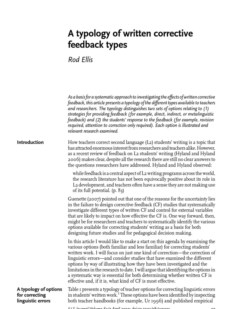 As a basis for a systematic approach to investigating the effects of written corrective feedback, this article presents a typology of the different types available to teachers and researchers. The typology distinguishes two sets of options relating to (1) strategies for providing feedback ( for example, direct, indirect, or metalinguistic feedback) and (2) the students’ response to the feedback ( for example, revision required, attention to correction only required). Each option is illustrated and relevant research examined.