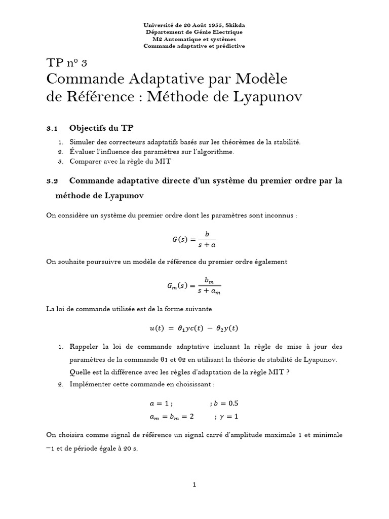 1. Simuler des correcteurs adaptatifs basés sur les théorèmes de la stabilité.