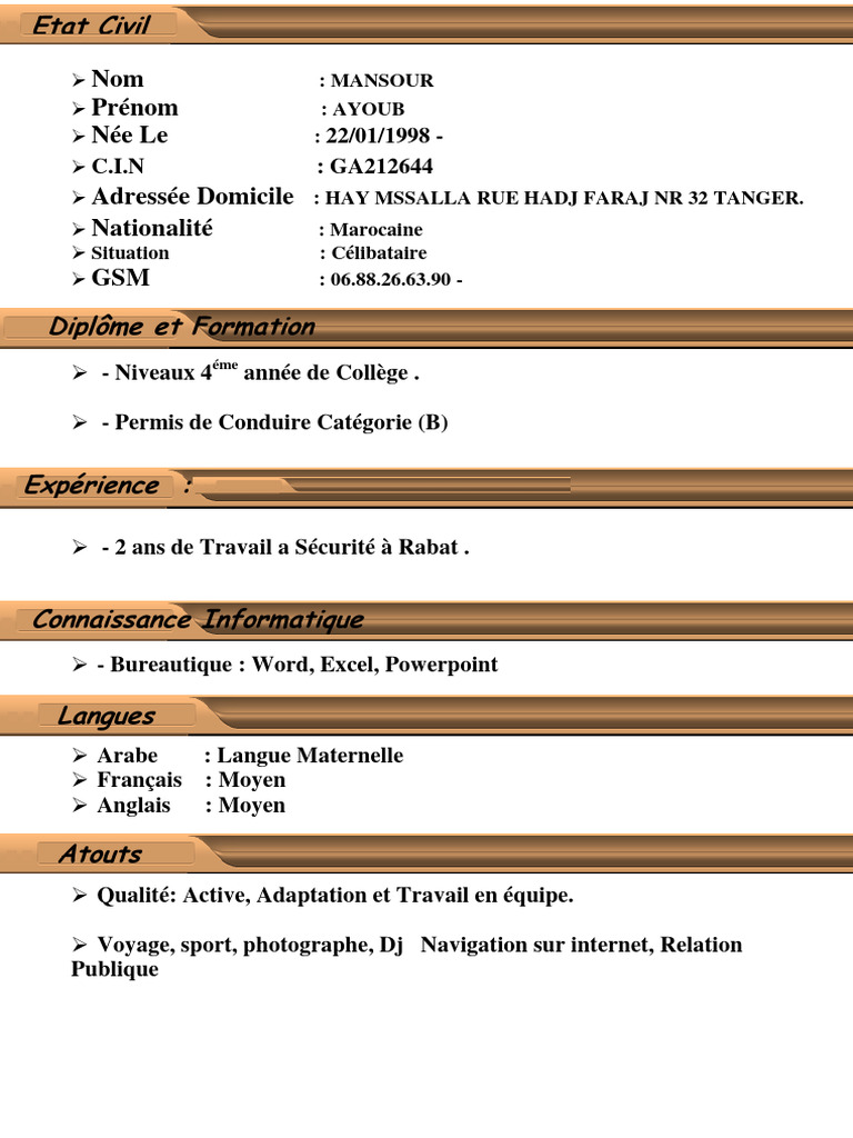 Adressée Domicile : HAY MSSALLA RUE HADJ FARAJ NR 32 TANGER.