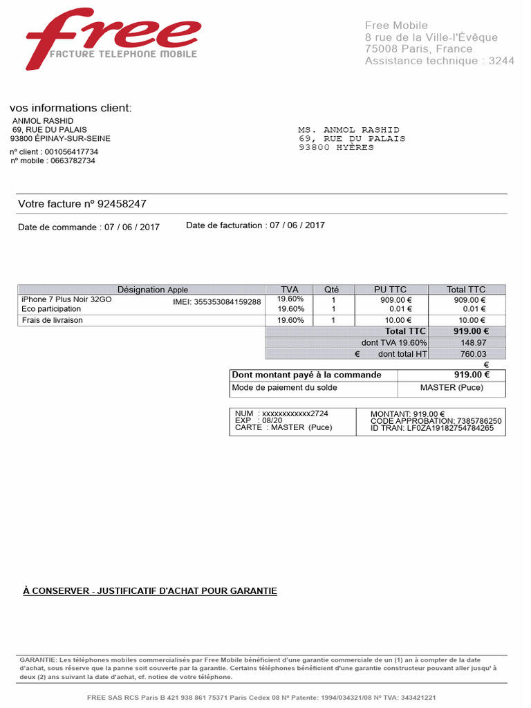 FACTURE TELEPHONE MOBILE 75008 Paris, France