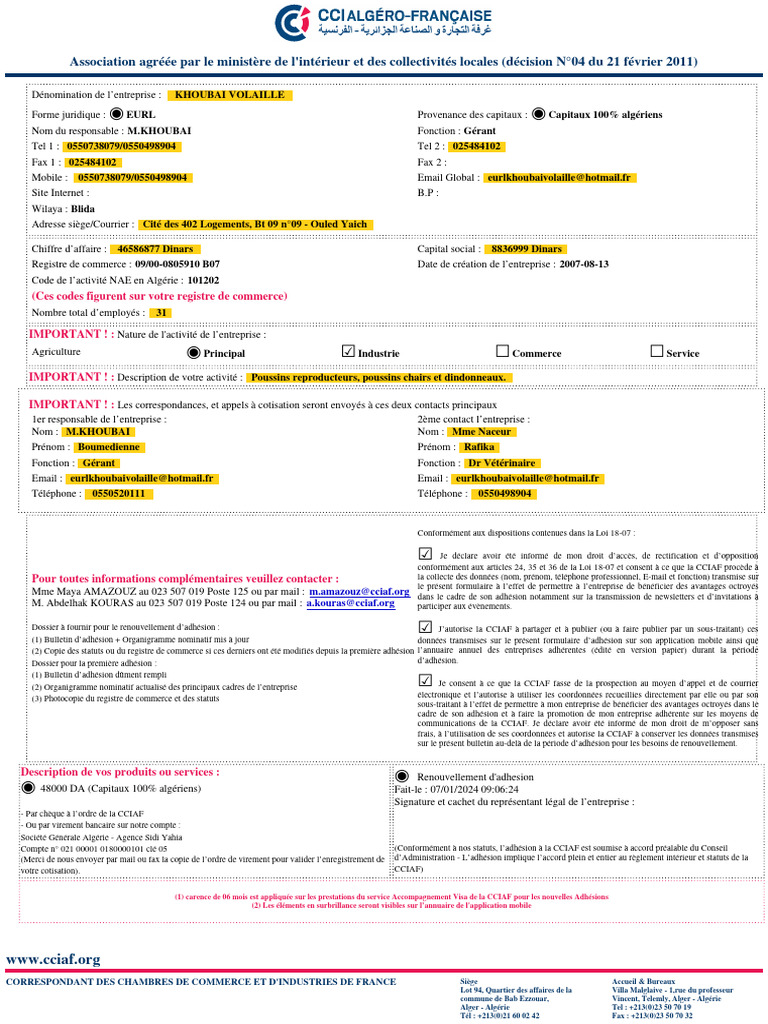 Dénomination de l’entreprise : KHOUBAI VOLAILLE