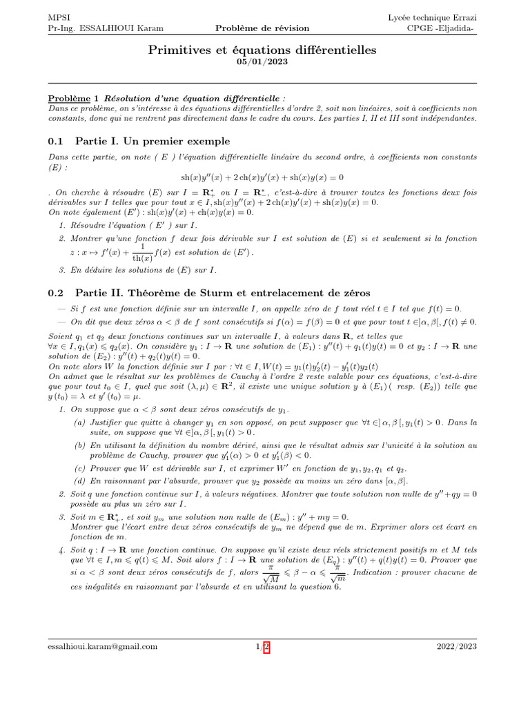 que ∀t ∈ I, m 6 q(t) 6 M. Soit alors f : I → R une solution de (Eq ) : y 00 (t) + q(t)y(t) = 0. Prouver que