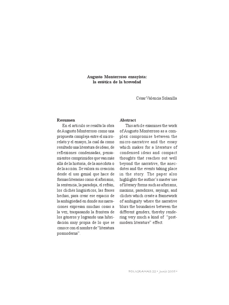 Abstract This article examines the work of Augusto Monterroso as a complex compromise between the micro-narrative and the essay which makes for a literature of condensed ideas and compact thoughts that reaches out well beyond the narrative, the anecdotes and the events taking place in the story. The paper also highlights the authors master use of literary forms such as aforisms, maxims, paradoxes, sayings, and clichs which create a framework of ambiguity where the narrative blurs the boundaries between the different genders, thereby rendering very much a kind of postmodern literature effect.