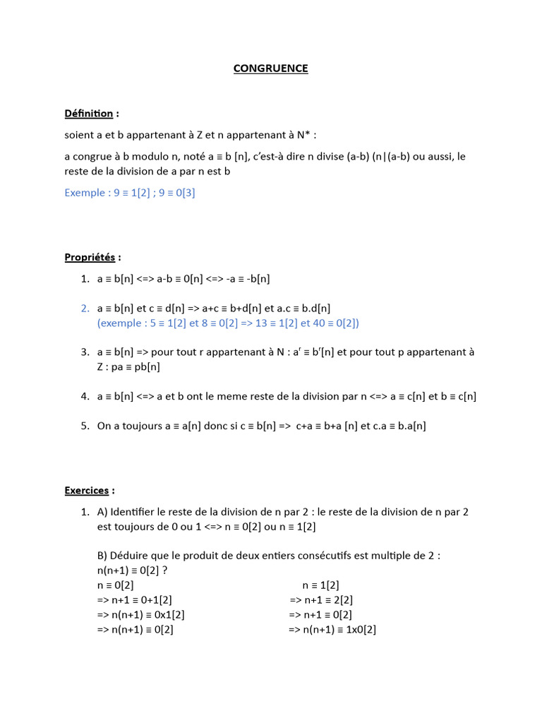 2. a ≡ b[n] et c ≡ d[n] => a+c ≡ b+d[n] et a.c ≡ b.d[n]