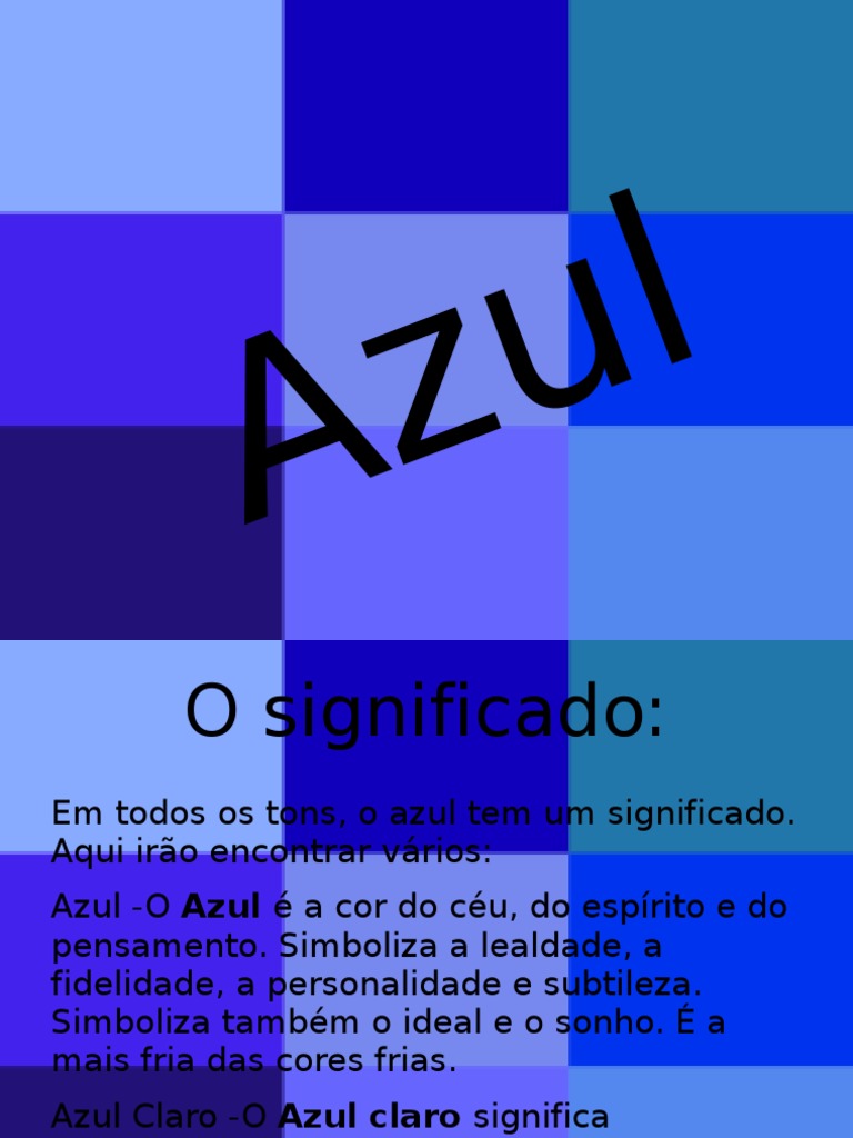 Em todos os tons, o azul tem um significado. Aqui iro encontrar vrios: Azul -O Azul a cor do cu, do esprito e do pensamento. Simboliza a lealdade, a fidelidade, a personalidade e subtileza. Simboliza tambm o ideal e o sonho. a mais fria das cores frias. Azul Claro -O Azul claro significa tranquilidade, compreenso e frescura.