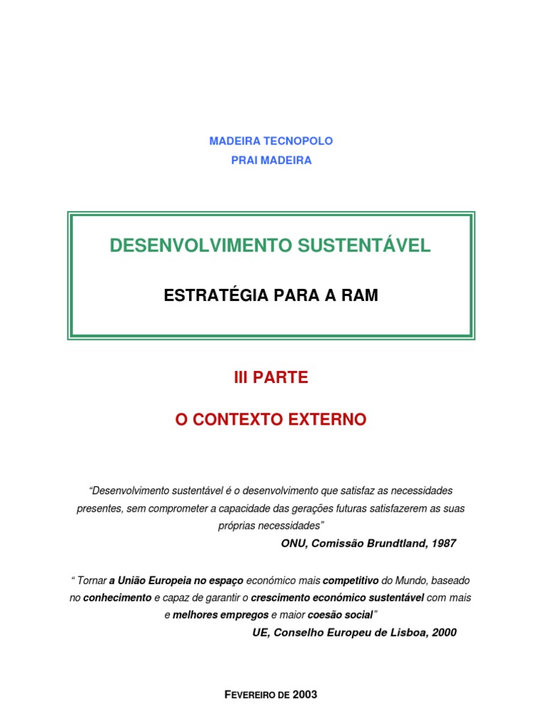 A ESTRATÉGIA NACIONAL DE DESENVOLVIMENTO SUSTENTÁVEL..17 Enquadramento Legal...................................................................................17 Enquadramento Económico e Financeiro..................................................18 A Proposta para uma Estratégia Nacional (ENDS 2002)...........................20 Princípios Orientadores...................................................................................20 Domínios Estratégicos.....................................................................................22 CONCLUSÃO DA ANÁLISE DO CONTEXTO EXTERNO............................24 A Definição de Desenvolvimento Sustentável...........................................24 O Conceito de Desenvolvimento Sustentável............................................24 As Temáticas do Desenvolvimento Sustentável.......................................24 No plano global. ...............................................................................................25 No plano europeu. ...........................................................................................25 No caso de Portugal. .......................................................................................26