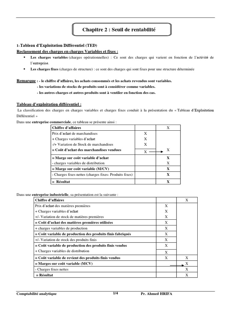 La classification des charges en charges variables et charges fixes conduit à la présentation du « Tableau d’Exploitation