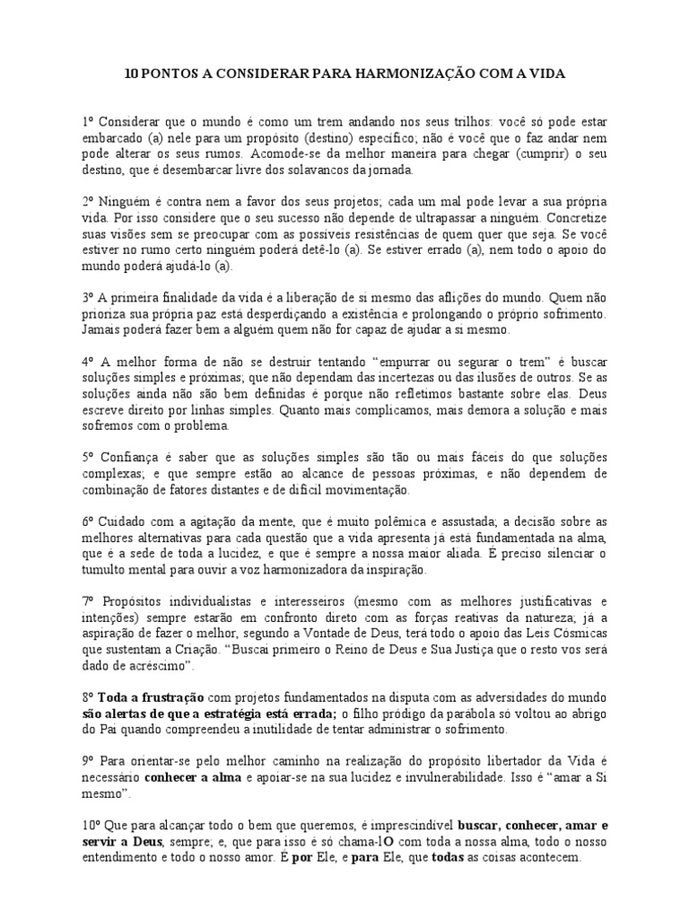 : voc s pode estar embarcado (a) nele para um propsito (destino) especfico; no voc que o faz andar nem pode alterar os seus rumos. Acomode-se da melhor maneira para chegar (cumprir) o seu destino, que desembarcar livre dos solavancos da jornada. 2 Ningum contra nem a favor dos seus projetos; cada um mal pode levar a sua prpria vida. Por isso considere que o seu sucesso no depende de ultrapassar a ningum. Concretize suas vises sem se preocupar com as possveis resistncias de quem quer que seja. Se voc estiver no rumo certo ningum poder det-lo (a). Se estiver errado (a), nem todo o apoio do mundo poder ajud-lo (a). 3 A primeira finalidade da vida a liberao de si mesmo das aflies do mundo. Quem no prioriza sua prpria paz est desperdiando a existncia e prolongando o prprio sofrimento. Jamais poder fazer bem a algum quem no for capaz de ajudar a si mesmo. 4 A melhor forma de no se destruir tentando empurrar ou segurar o trem buscar solues simples e prximas; que no dependam das incertezas ou das iluses de outros. Se as solues ainda no so bem definidas porque no refletimos bastante sobre elas. Deus escreve direito por linhas simples. Quanto mais complicamos, mais demora a soluo e mais sofremos com o problema. 5 Confiana saber que as solues simples so to ou mais fceis do que solues complexas; e que sempre esto ao alcance de pessoas prximas, e no dependem de combinao de fatores distantes e de difcil movimentao. 6 Cuidado com a agitao da mente, que muito polmica e assustada; a deciso sobre as melhores alternativas para cada questo que a vida apresenta j est fundamentada na alma, que a sede de toda a lucidez, e que sempre a nossa maior aliada. preciso silenciar o tumulto mental para ouvir a voz harmonizadora da inspirao. 7 Propsitos individualistas e interesseiros (mesmo com as melhores justificativas e intenes) sempre estaro em confronto direto com as foras reativas da natureza; j a aspirao de fazer o melhor, segundo a Vontade de Deus, ter todo o apoio das Leis Csmicas que sustentam a Criao. Buscai primeiro o Reino de Deus e Sua Justia que o resto vos ser dado de acrscimo. 8 Toda a frustrao com projetos fundamentados na disputa com as adversidades do mundo so alertas de que a estratgia est errada; o filho prdigo da parbola s voltou ao abrigo do Pai quando compreendeu a inutilidade de tentar administrar o sofrimento. 9 Para orientar-se pelo melhor caminho na realizao do propsito libertador da Vida necessrio conhecer a alma e apoiar-se na sua lucidez e invulnerabilidade. Isso amar a Si mesmo. 10 Que para alcanar todo o bem que queremos, imprescindvel buscar, conhecer, amar e servir a Deus, sempre; e, que para isso s chama-lO com toda a nossa alma, todo o nosso entendimento e todo o nosso amor. por Ele, e para Ele, que todas as coisas acontecem.