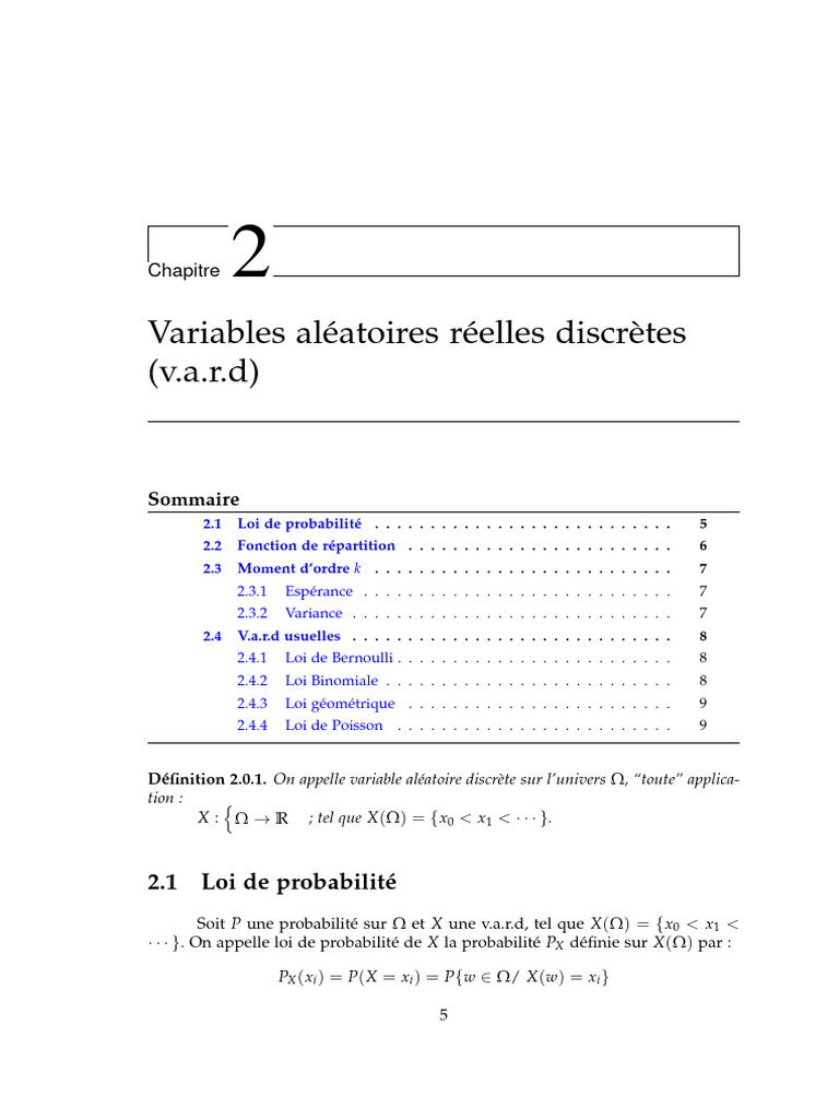 2.1 Loi de probabilité . . . . . . . . . . . . . . . . . . . . . . . . . . . 5