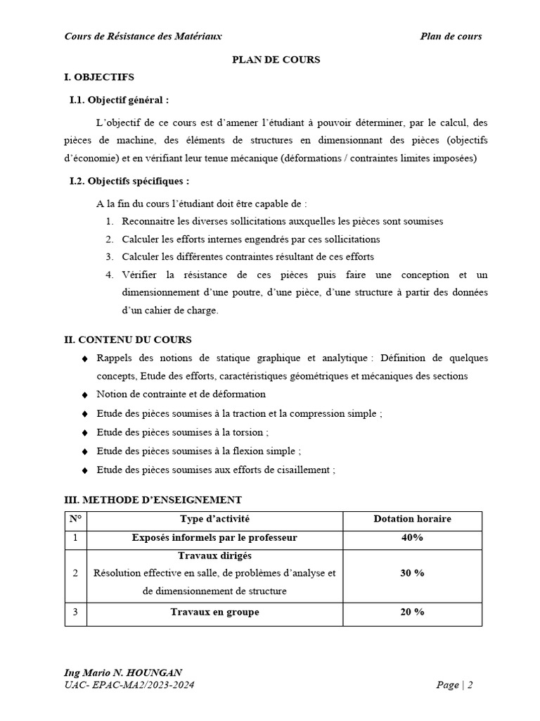 Cours de Résistance des Matériaux Plan de cours
