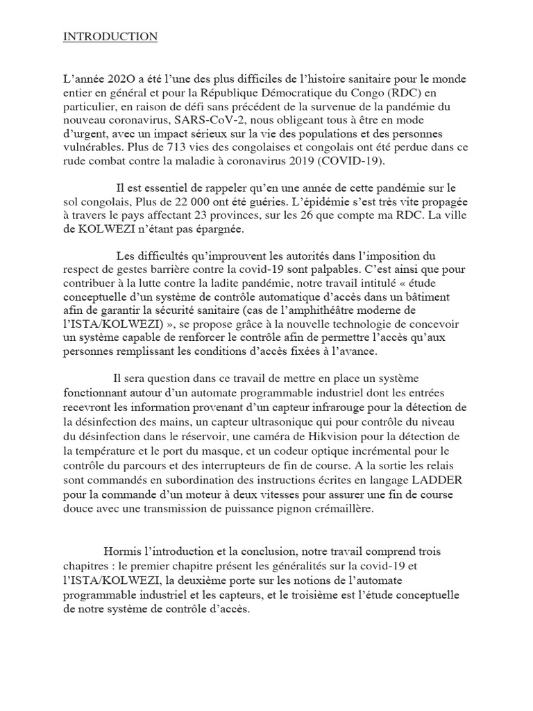 présent travail contrôle l’accès dans la salle enfin de lutte contre la propagation