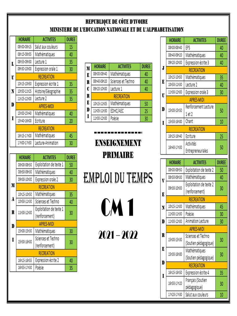 HORAIRE ACTIVITES DUREE PRIMAIRE