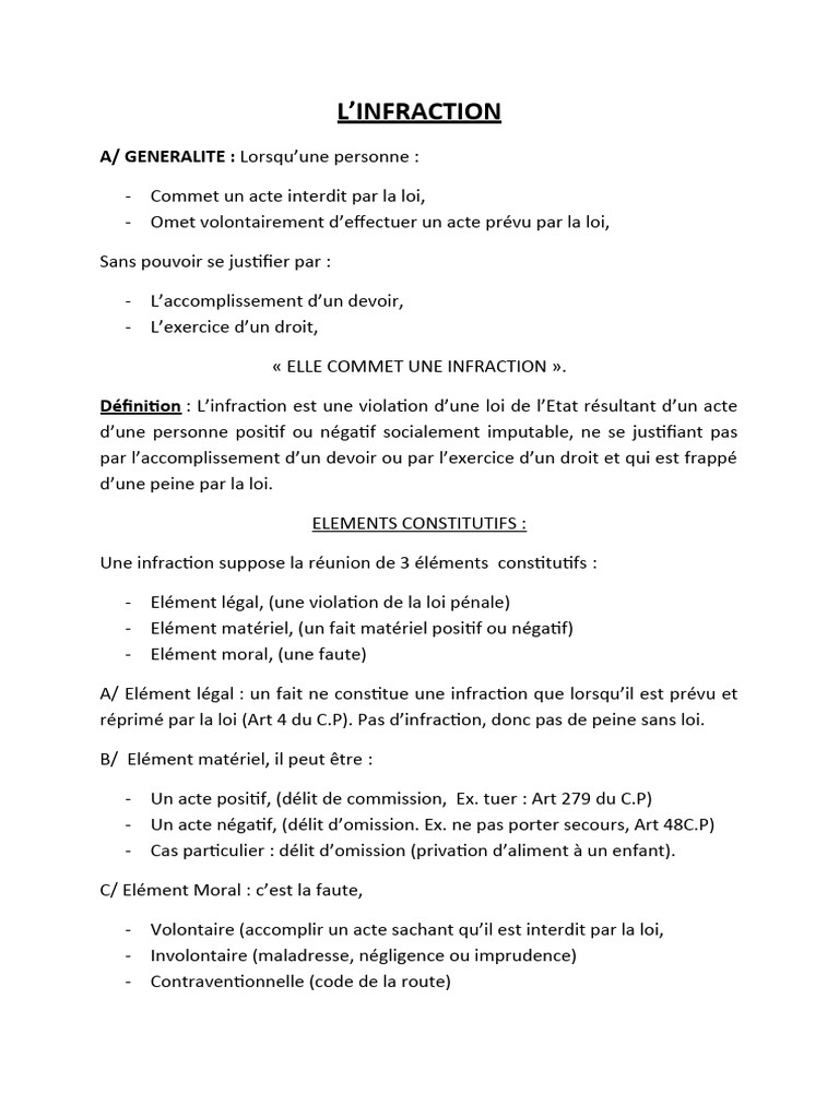 Définition : L’infraction est une violation d’une loi de l’Etat résultant d’un acte