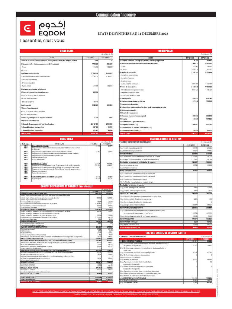 de l'exercice début de l'exercice titre de l'exercice l'exercice EQDOM, société anonyme de droit commun constituée au Maroc en - Pour EQDOM : les sommes dues pat l’Etat, et les autres débiteurs, ainsi