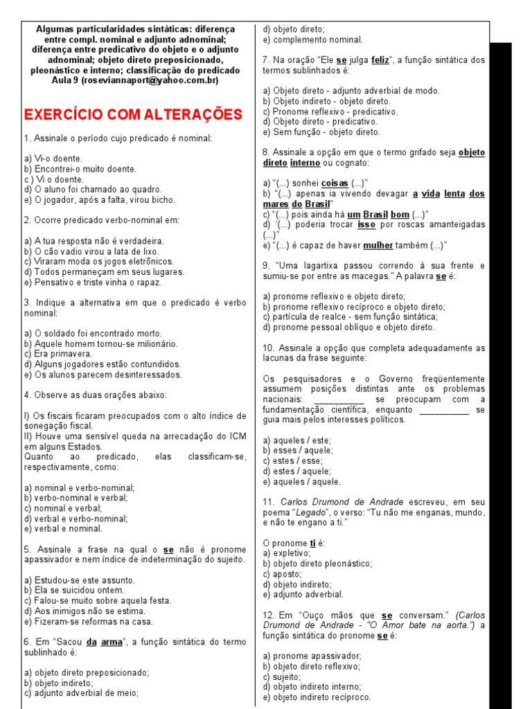 d) objeto direto; e) complemento nominal. 7. Na orao Ele se julga feliz, a funo sinttica dos termos sublinhados : a) Objeto direto - adjunto adverbial de modo. b) Objeto indireto - objeto direto. c) Pronome reflexivo - predicativo. d) Objeto direto - predicativo. e) Sem funo - objeto direto. 8. Assinale a opo em que o termo grifado seja objeto direto interno ou cognato: a) (...) sonhei coisas (...) b) (...) apenas ia vivendo devagar a vida lenta dos mares do Brasil c) (...) pois ainda h um Brasil bom (...) d) (...) poderia trocar isso por roscas amanteigadas (...) e) (...) capaz de haver mulher tambm (...) 9. Uma lagartixa passou correndo sua frente e sumiu-se por entre as macegas. A palavra se : a) pronome reflexivo e objeto direto; b) pronome reflexivo recproco e objeto direto; c) partcula de realce - sem funo sinttica; d) pronome pessoal oblquo e objeto direto. 10. Assinale a opo que completa adequadamente as lacunas da frase seguinte: Os pesquisadores e o Governo freqentemente assumem posies distintas ante os problemas nacionais: __________ se preocupam com a fundamentao cientfica, enquanto __________ se guia mais pelos interesses polticos. a) aqueles / este; b) esses / aquele; c) estes / esse; d) estes / aquele; e) aqueles / aquele. 11. Carlos Drumond de Andrade escreveu, em seu poema Legado, o verso: Tu no me enganas, mundo, e no te engano a ti. O pronome ti : a) expletivo; b) objeto direto pleonstico; c) aposto; d) objeto indireto; e) adjunto adverbial. 12. Em Ouo mos que se conversam. (Carlos Drumond de Andrade - O Amor bate na aorta.) a funo sinttica do pronome se : a) pronome apassivador; b) objeto direto reflexivo; c) sujeito; d) objeto indireto interno; e) objeto indireto recproco.