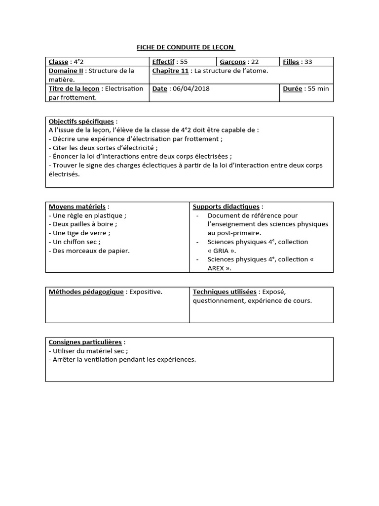 Titre de la leçon : Electrisation Date : 06/04/2018 Durée : 55 min