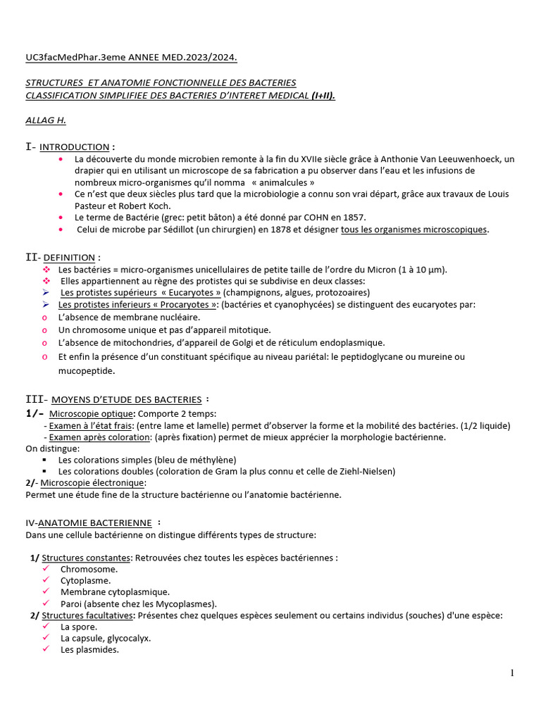 CLASSIFICATION SIMPLIFIEE DES BACTERIES D’INTERET MEDICAL (I+II).