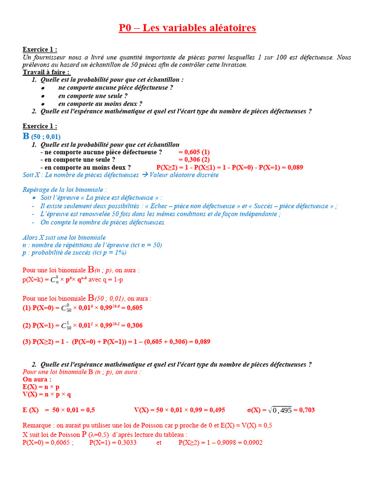Remarque : on aurait pu utiliser une loi de Poisson car p proche de 0 et E(X) ≈ V(X) ≈ 0,5