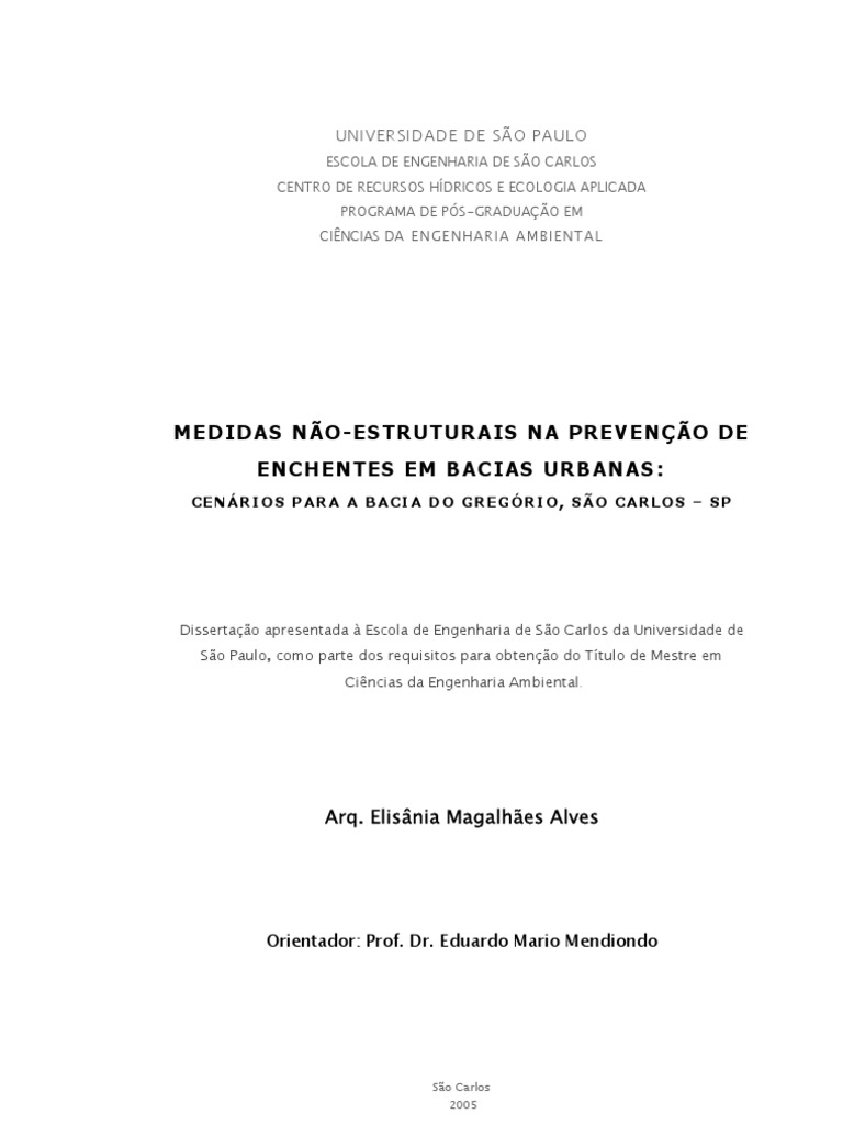 ALVES, E. M. (2005). Non-structural measures on prevention of floods in urban basins: Scenarios for Gregrio river watershed, So Carlos - SP: 149p. Dissertao (Mestrado) - Escola de Engenharia de So Carlos, Universidade de So Paulo, So Carlos, 2005.