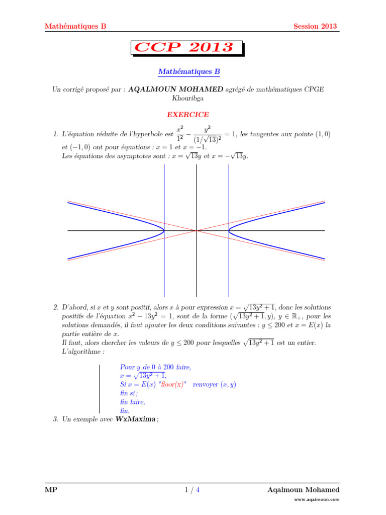 Un corrigé proposé par : AQALMOUN MOHAMED agrégé de mathématiques CPGE