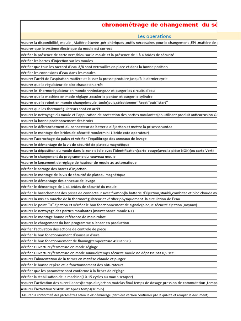 Assurer la disponibilité, moule ,Matière étuvée ,périphériques ,outils nécessaires pour le changement ,EPI ,matière de purger PC to PM